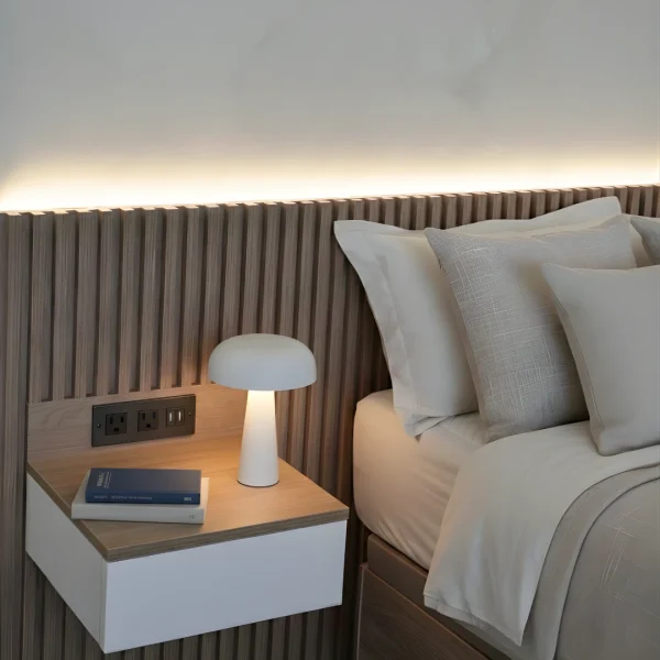 ListNight es un cabecero a medida con listones de madera que incluye luz LED integrada y mesitas de noche flotantes, pensado para quienes desean un dormitorio con estilo, orden y funcionalidad. Su diseño limpio y contemporáneo transforma cualquier dormitorio en un espacio acogedor y moderno.