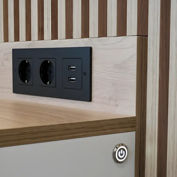 Tendrás la posibilidad de controlar el sistema de encendido con sensor táctil integrado, mando a distancia o cable para conmutar o salida cable con schuko, además de regular la temperatura de la luz LED para ambientes más cálidas o neutros. También cuenta con la opción de integrar enchufes o tomas eléctricas existentes dentro del diseño.