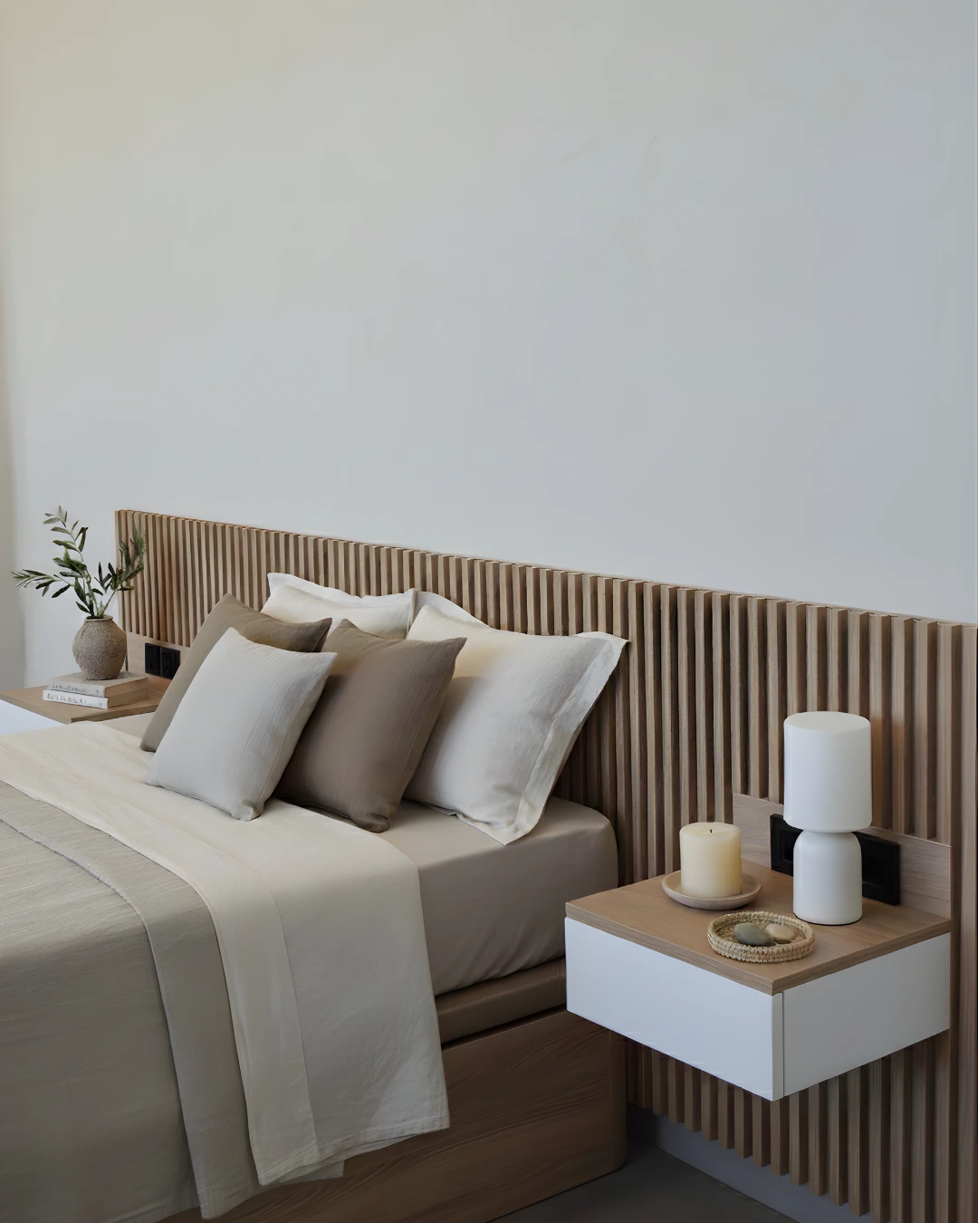 El cabecero incorpora listones verticales de madera de 19 mm, lo que aporta ligereza visual y una estética moderna. Además, incorpora una luz LED integrada, disponible con temperatura cálida o neutra, ideal para crear un ambiente relajante. Las mesitas flotantes forman parte del conjunto, liberando espacio visual y facilitando la limpieza.