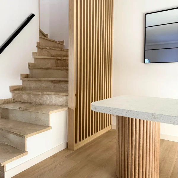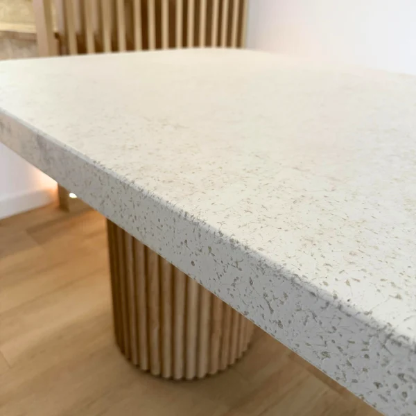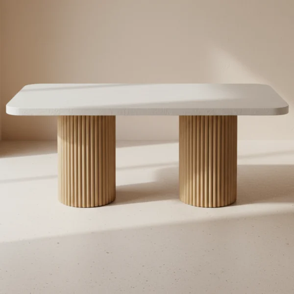 La mesa Zenith está fabricada con maderas seleccionadas y melaminas de alta calidad, resistentes al uso diario y al paso del tiempo. Los listones curvados que conforman su base aportan estabilidad y ligereza visual, creando un juego de volúmenes que refuerza la sensación de diseño contemporáneo.