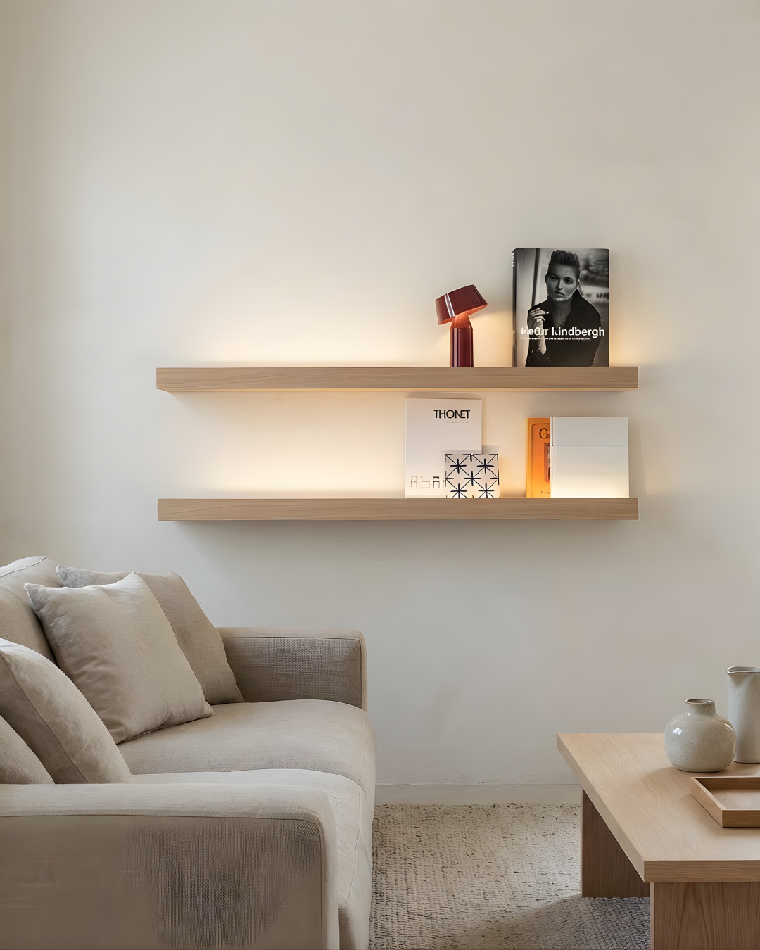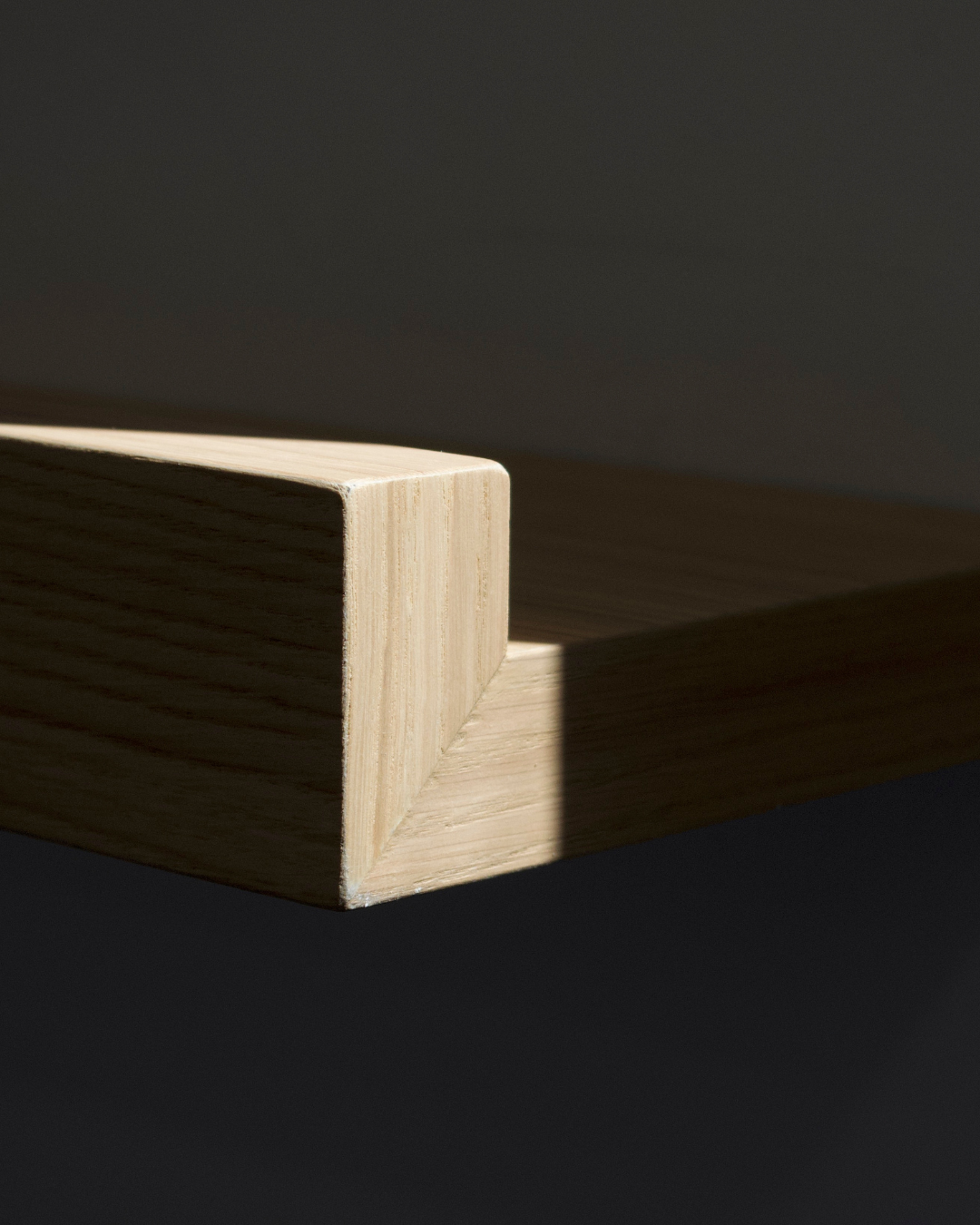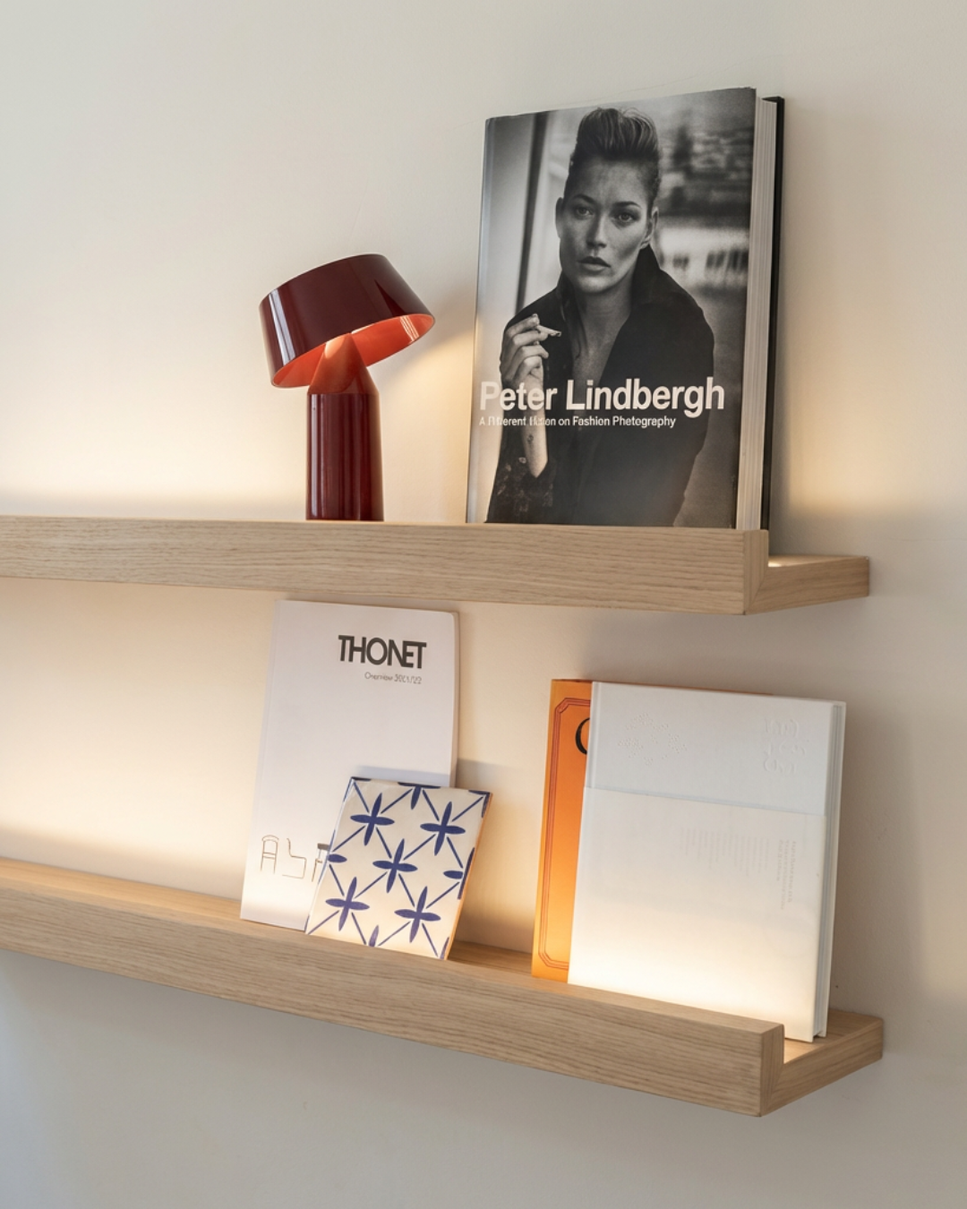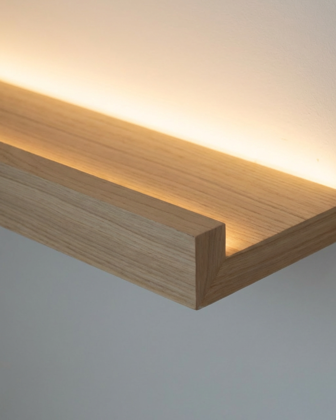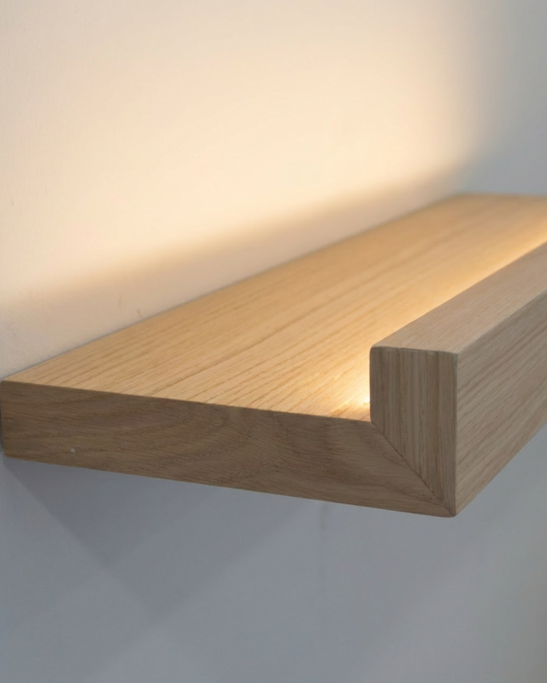 Balda flotante con frontal de seguridad, diseñada para exponer libros, cuadros y láminas sin que se deslicen. Fabricada a medida y disponible con luz LED cálida integrada para crear un ambiente más acogedor.