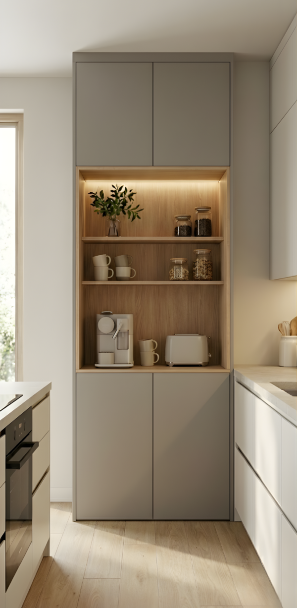 Nicho central abierto: con estantes regulables y opción de incluir iluminación LED cálida integrada. Perfecto para colocar la cafetera, pequeños electrodomésticos u objetos decorativos.