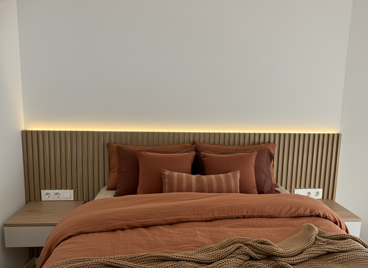Con un diseño limpio y minimalista, y una altura estándar de 100cm, esta pieza se instala fácilmente y ofrece una solución todo-en-uno para quienes buscan comodidad, orden visual y un toque cálido gracias a su iluminación indirecta. Además ofrecemos la posibilidad de integrar los enchufes existentes de tu dormitorio con el cabecero.