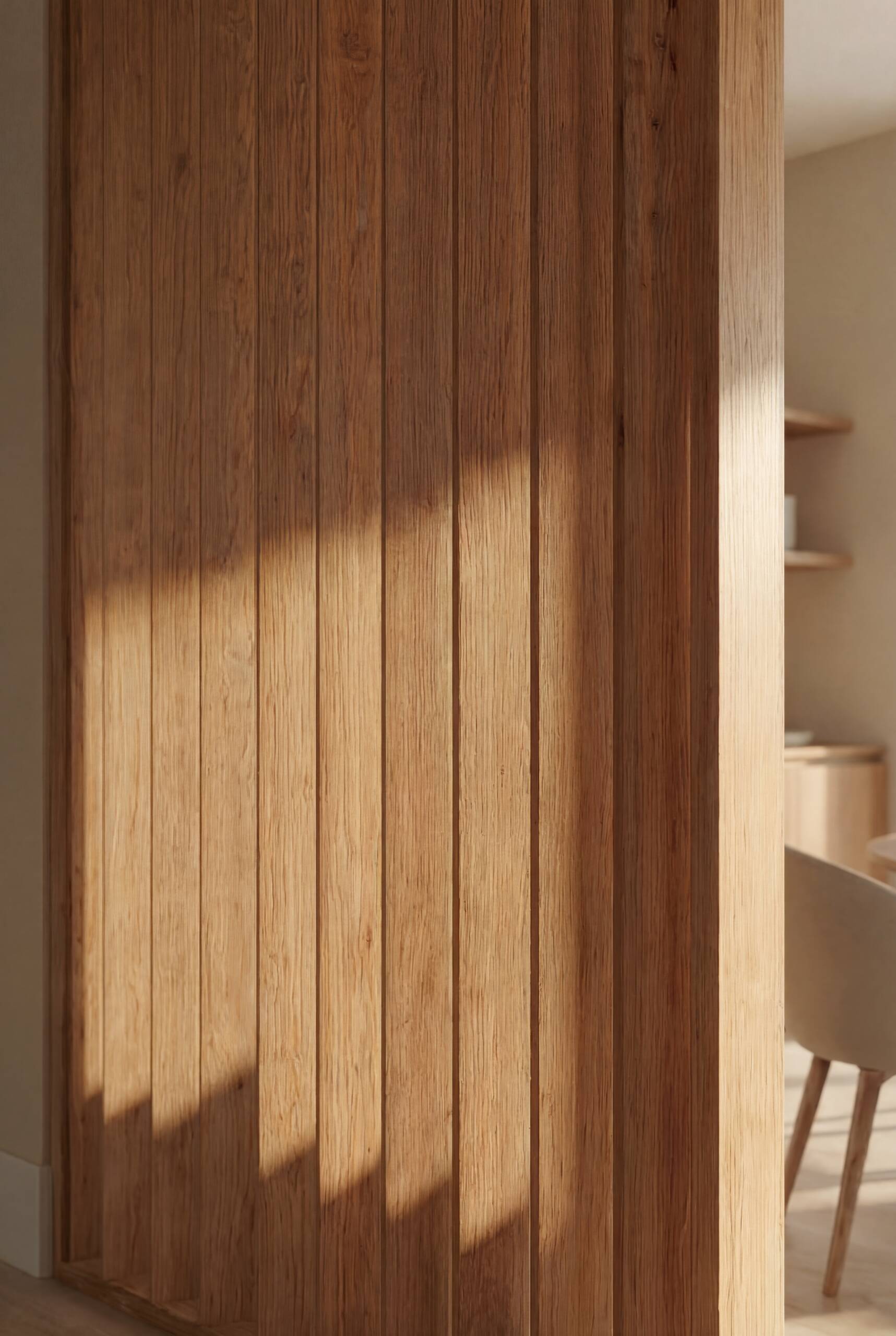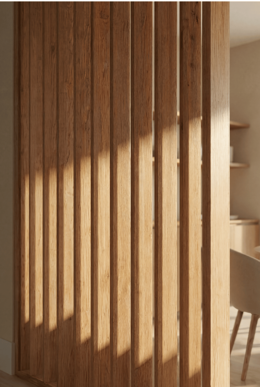 - Lamas verticales de madera como separadores de espacios, ancladas a un marco de madera. Los separadores son de melamina. Este sistema giratorio permite la rotación de lama ofreciendo distintas posiciones, separador opaco (lamas cerradas), en diagonal o rectas.