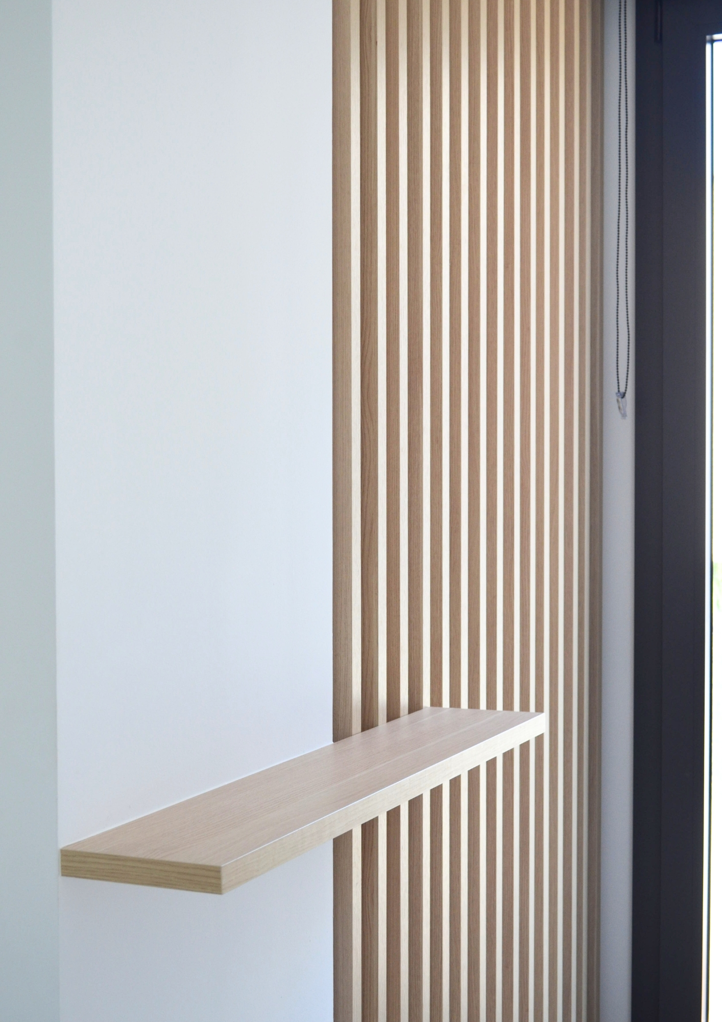 Lamas verticales de madera como separadores de espacios, anclados de suelo a techo, con soporte de madera. Los separadores son de melamina decorativas sin soporte transversal visto.