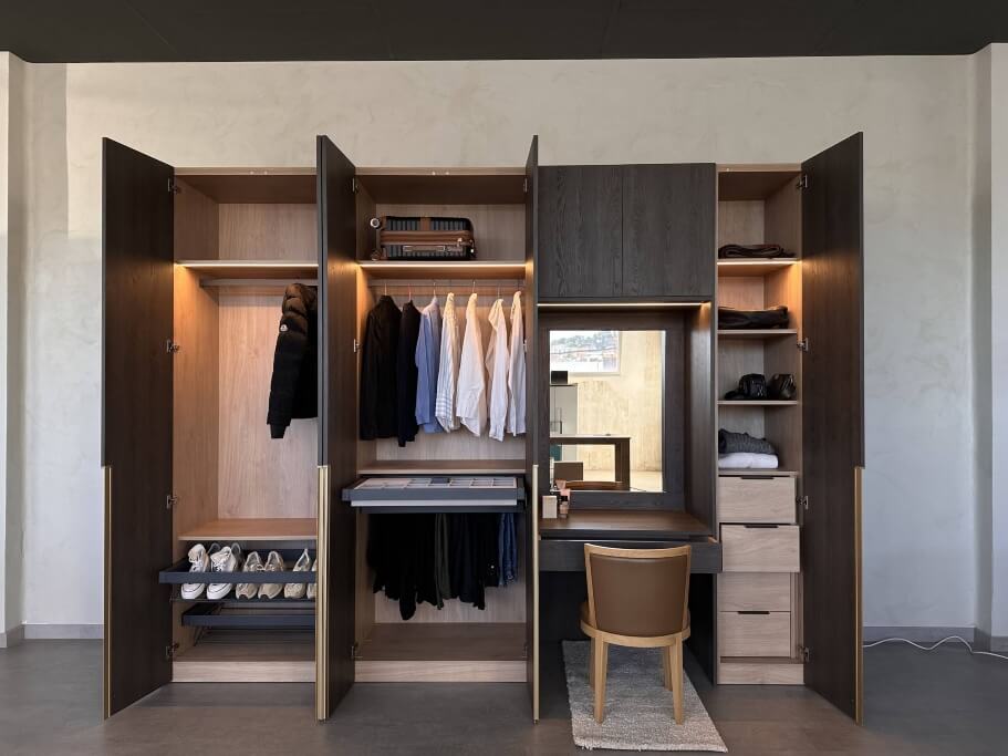 Los armarios a medida no solo son más bonitos: también están pensados para hacerte la vida más fácil. Al diseñar la distribución interior según tus necesidades, cada prenda y complemento tiene su lugar. La ropa está siempre a mano, los cajones se abren suavemente gracias a sus guías decelerantes, y los estantes regulables permiten reorganizar el interior cuando lo necesites.